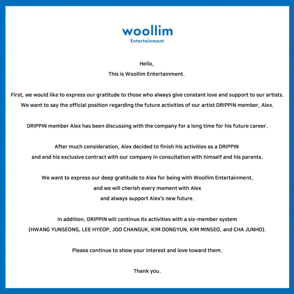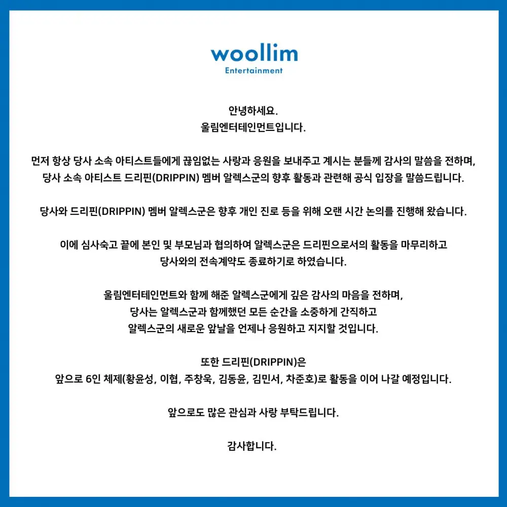 เมื่อวันที่ 28 กรกฎาคม KSTวูลลิม เอนเตอร์เทนเมนต์แจ้งข่าวสารสมาชิก DRIPPINอเล็กซ์กำลังจะออกจากทีม