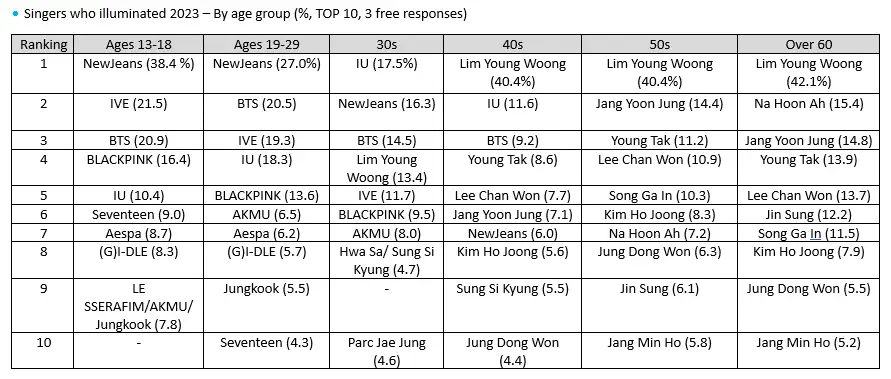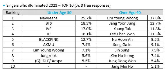 นักร้องนอก 10 อันดับแรกในกลุ่มอายุ 40 ปีขึ้นไป ได้แก่ BTS (4.5%), IU (4.4%),คิมยอนจา(3.2%)อัน ซอง ฮุน(2.7%)โจ ยอง พิล, นิวยีนส์ (ทั้งคู่ 2.5%),นัมจิน, ซอง ซีคยอง (ทั้งคู่ 2.4%),อีซึงชอล, ยางจีอึน(ทั้งคู่อยู่ที่ 1.8%), แบล็คพิงค์,อิม มุนเซ, โจฮังโจ(ทั้งหมดอยู่ที่ 1.6%)